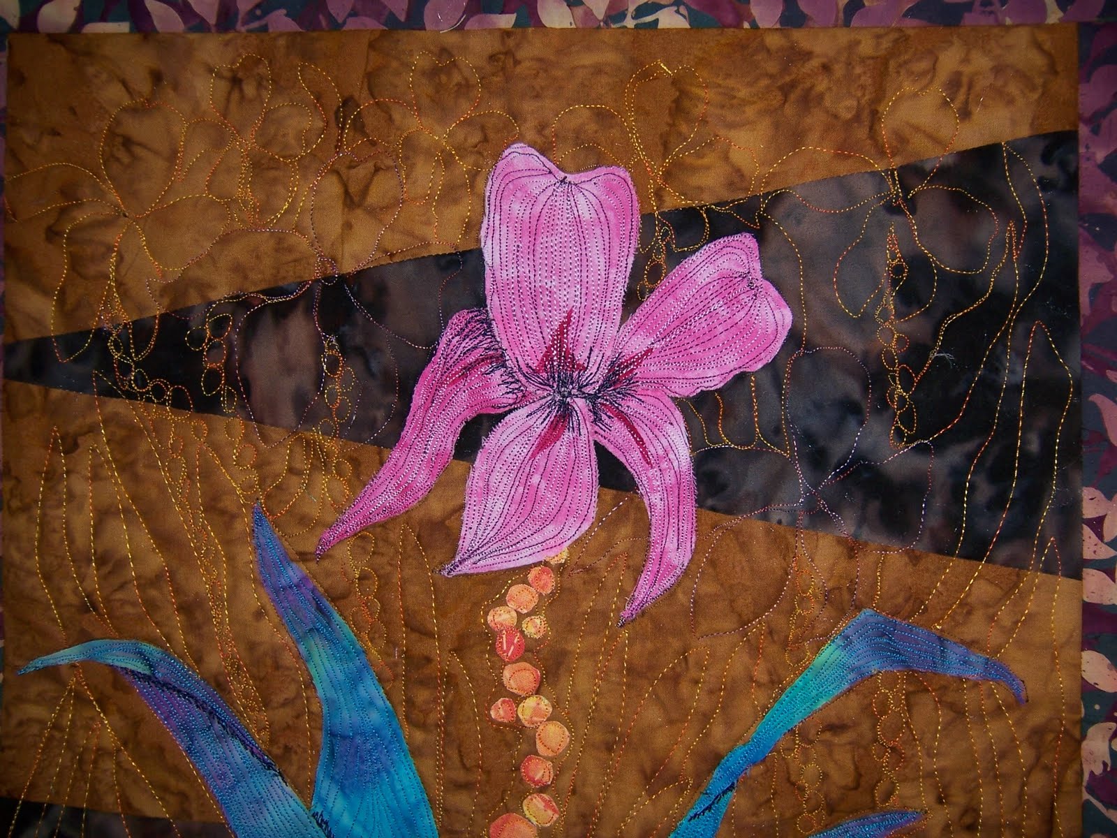This is a beautiful piece Ann. Your colors are well chosen and the Iris really comes forward off of the background. How you interpreted the stem is lovely! The quilted background is very nice and you have done a wonderful job on this piece. Have fun at your workshop.